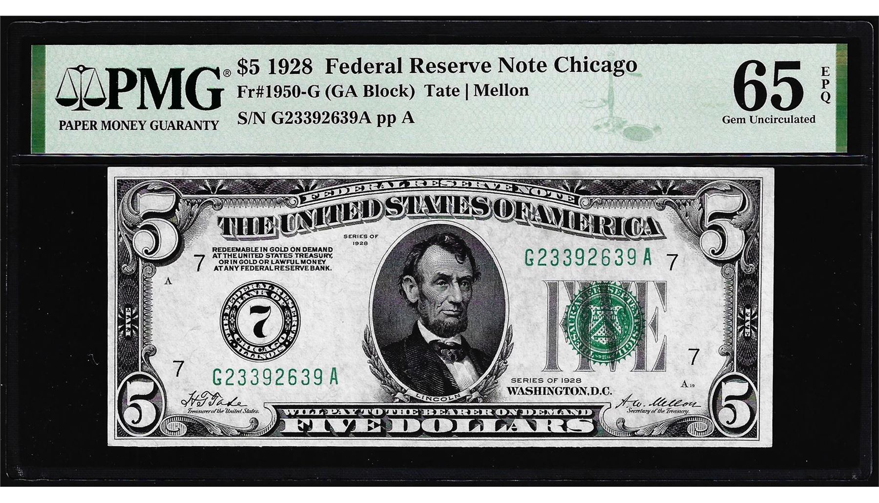 One 1928 $5 Federal Reserve Note Fr.1950-G PMG Gem Uncirculated 65EPQ. PMG Certified.