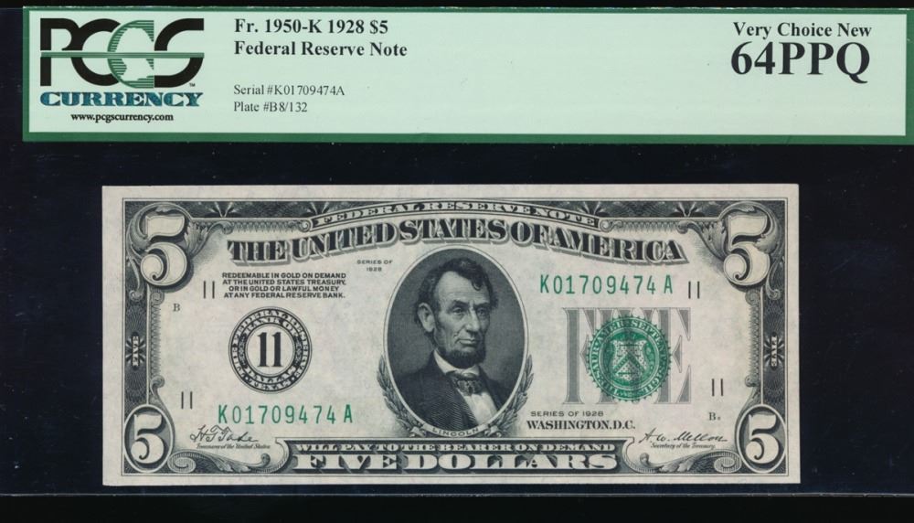 One 1928 $5 Federal Reserve Note PCGS 64PPQ.