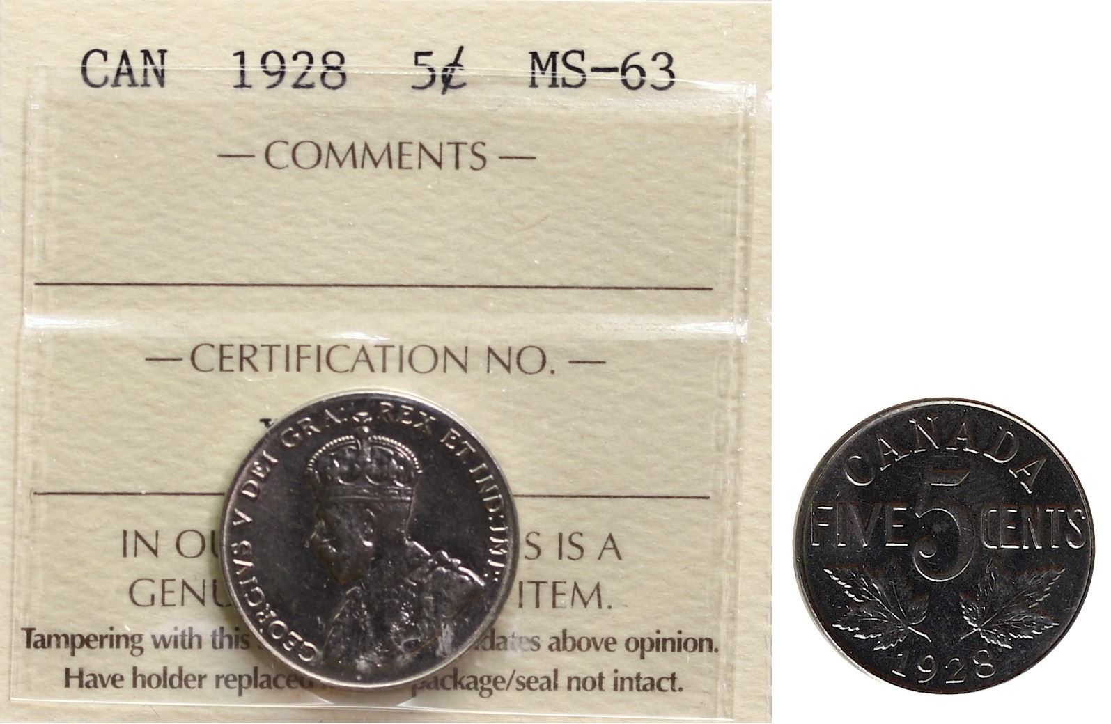 1928 5¢ ICCS Choice Mint State-63. A bright MS example.
