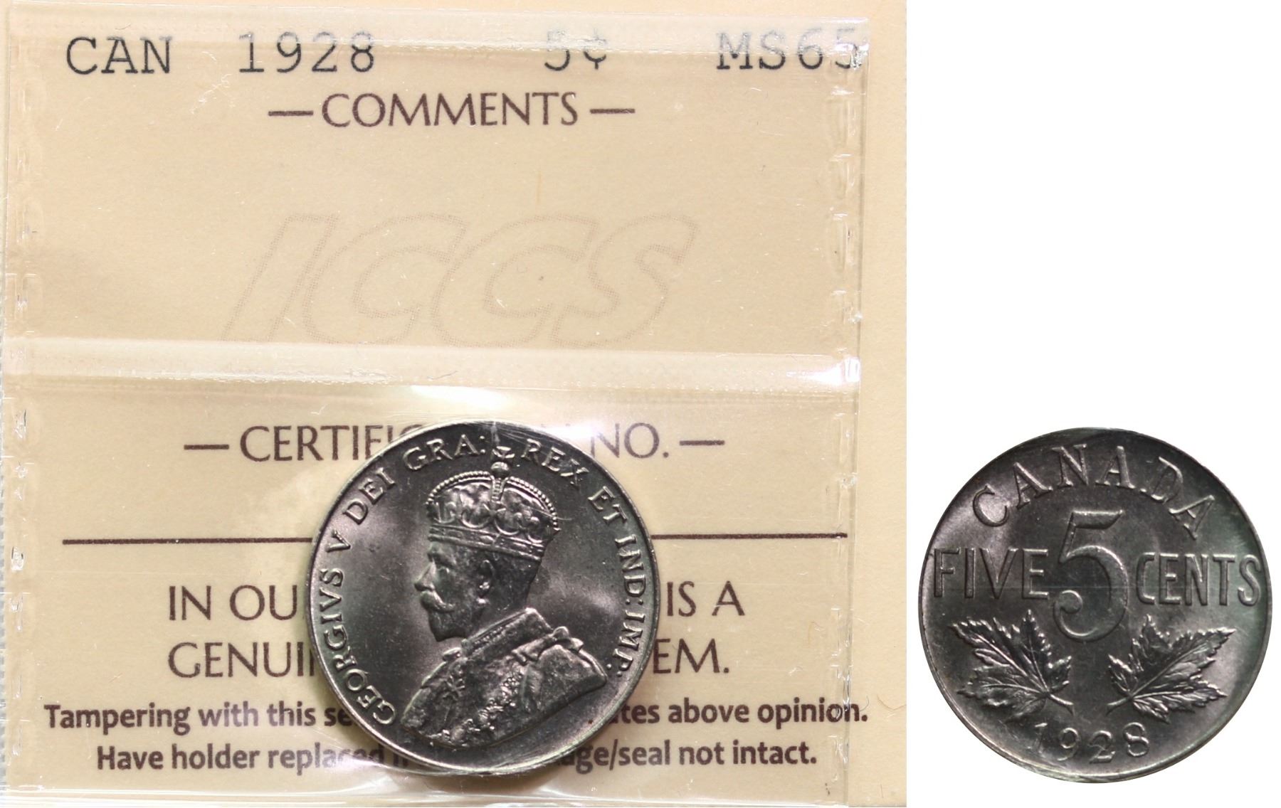 1928 5¢ ICCS Gem Mint State-65. Well struck with full original lustre and clean fields.
