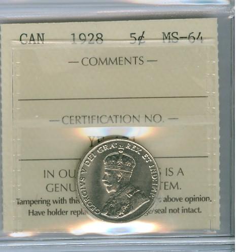 1928 5¢ ICCS MS64. Flashy, looks better.