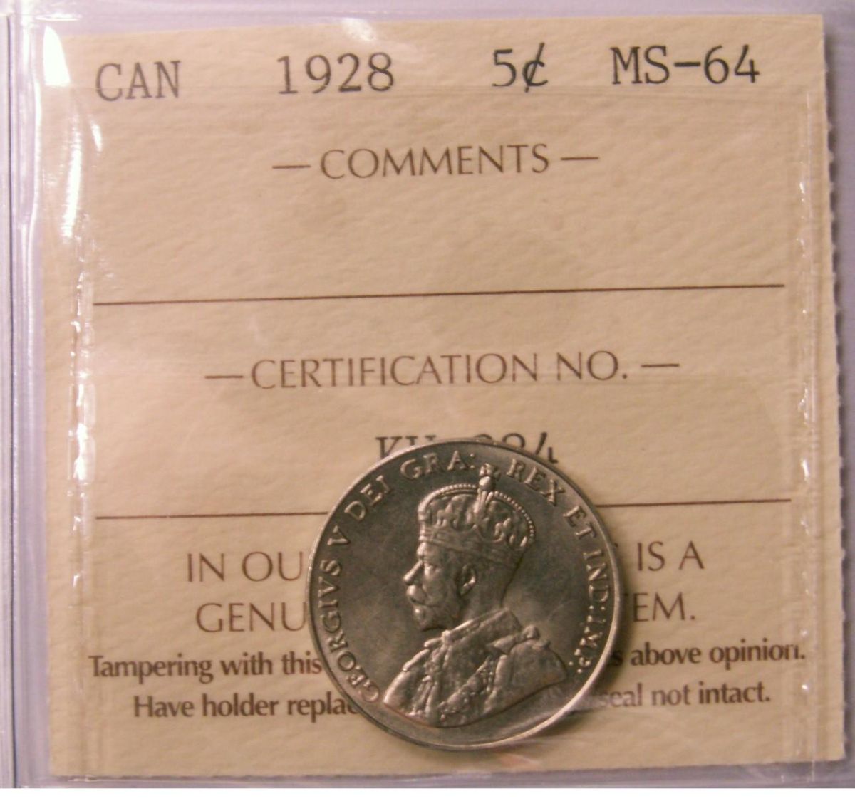 1928 5¢ ICCS MS64. Well struck and fully lustrous.