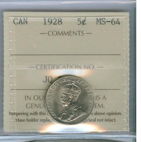 1928 5¢ ICCS MS64. Well struck and lustrous issue.