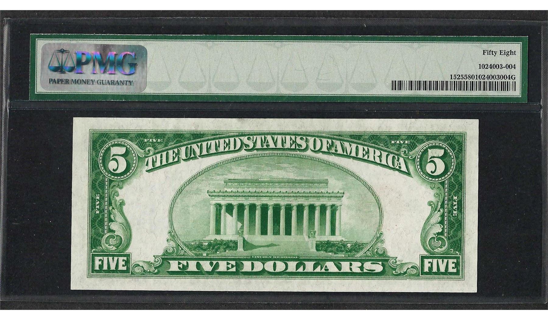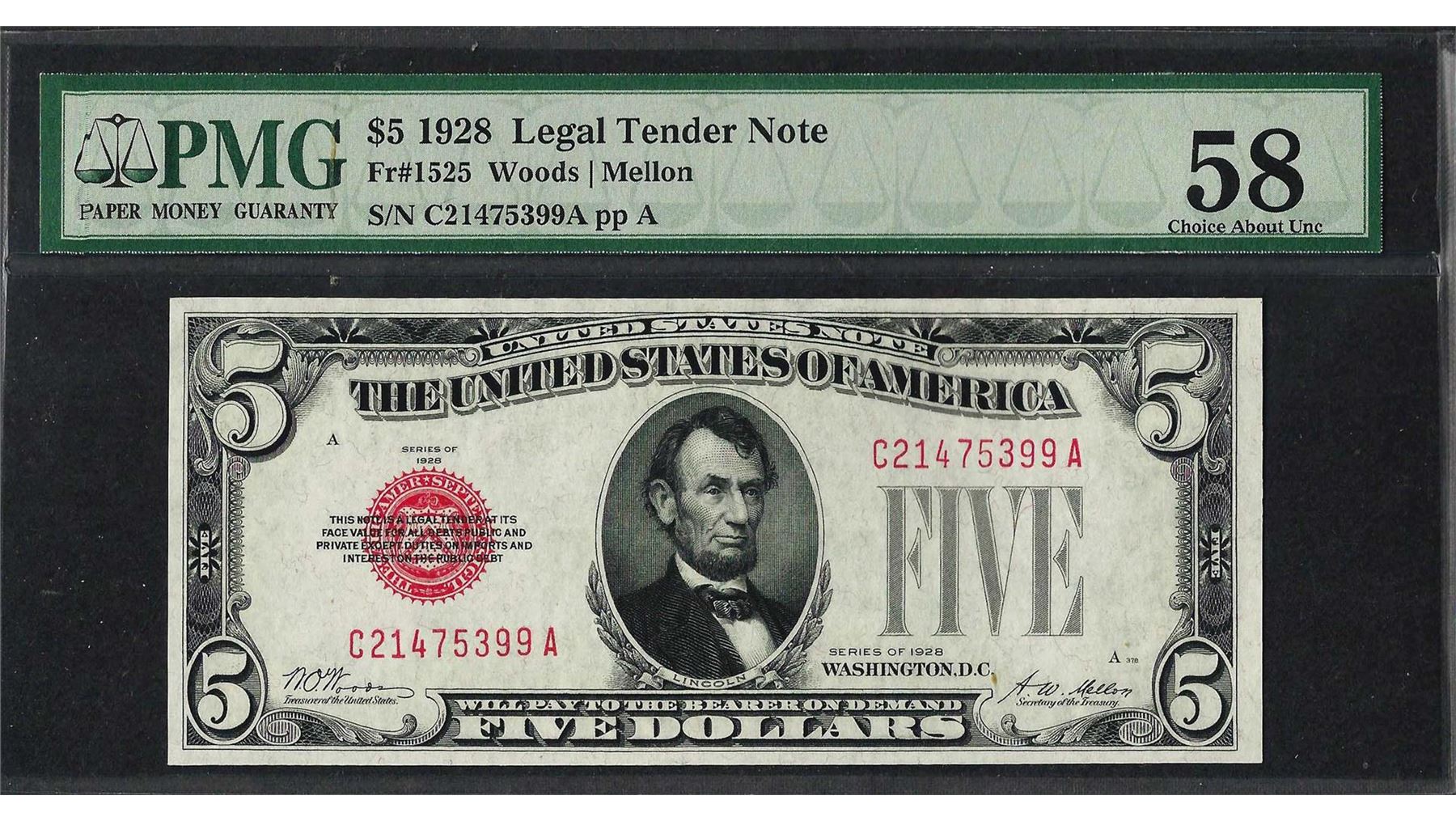 One 1928 $5 Legal Tender Note Fr.1525 PMG Choice About Uncirculated 58. PMG Certified.
