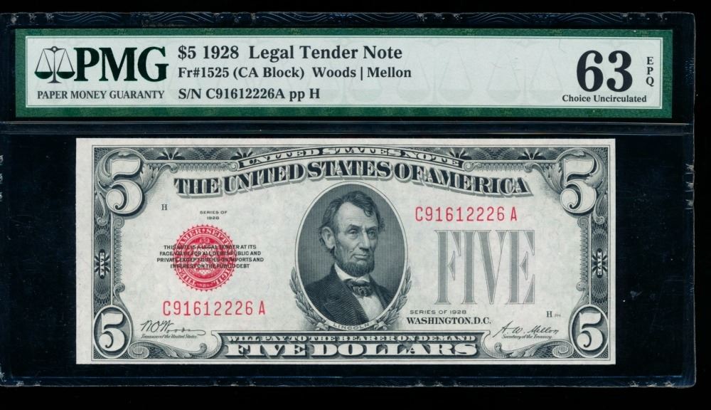 One 1928 $5 Legal Tender Note PMG 63EPQ.