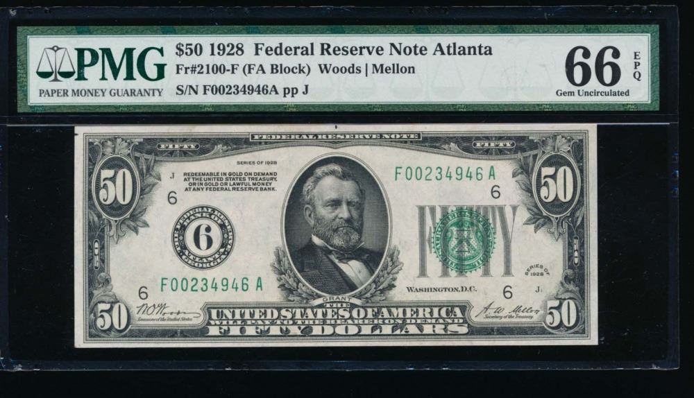One 1928 $50 Atlanta Federal Reserve Note PMG 66EPQ.