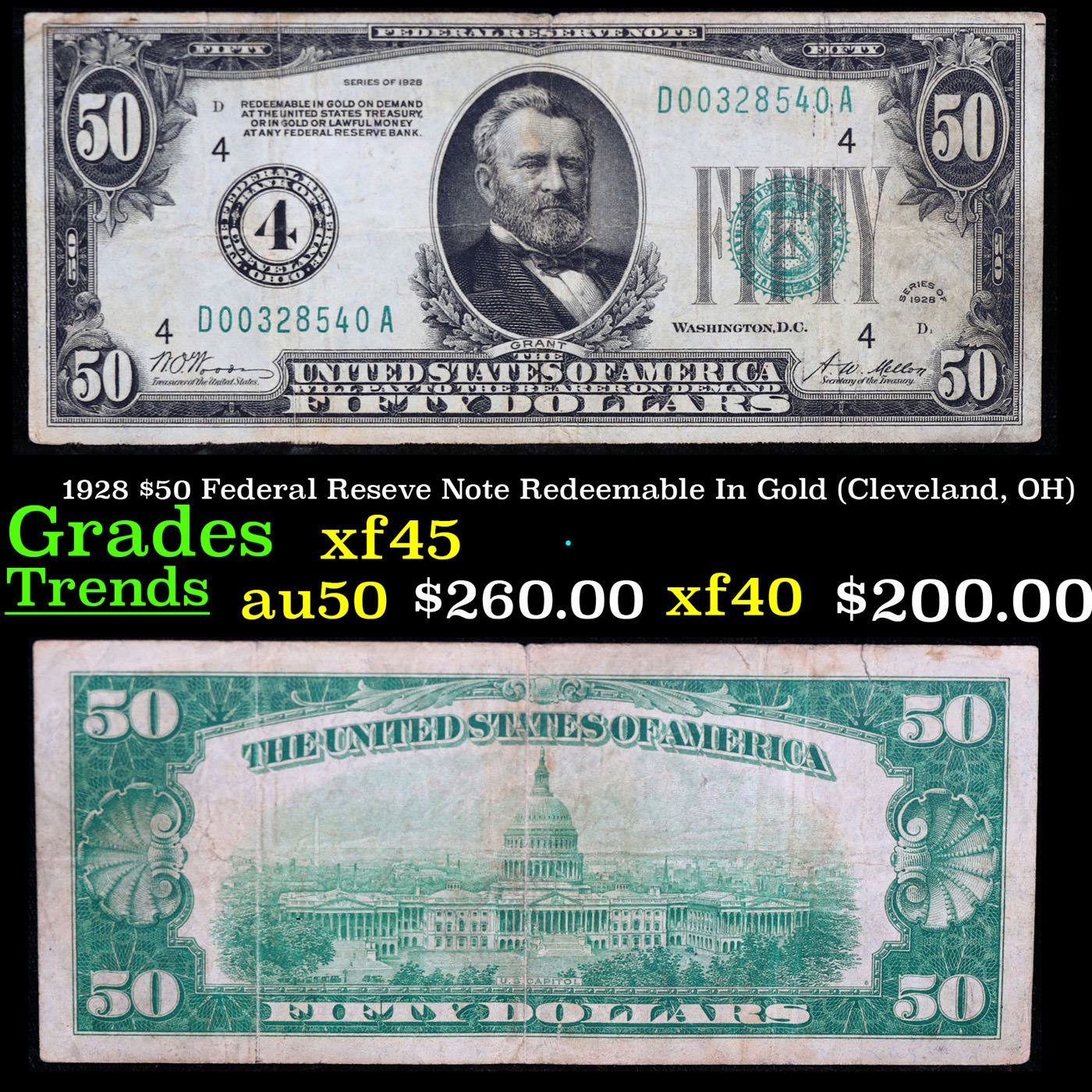 1928 $50 Federal Reseve Note Redeemable In Gold (Cleveland, OH) Grades xf+.