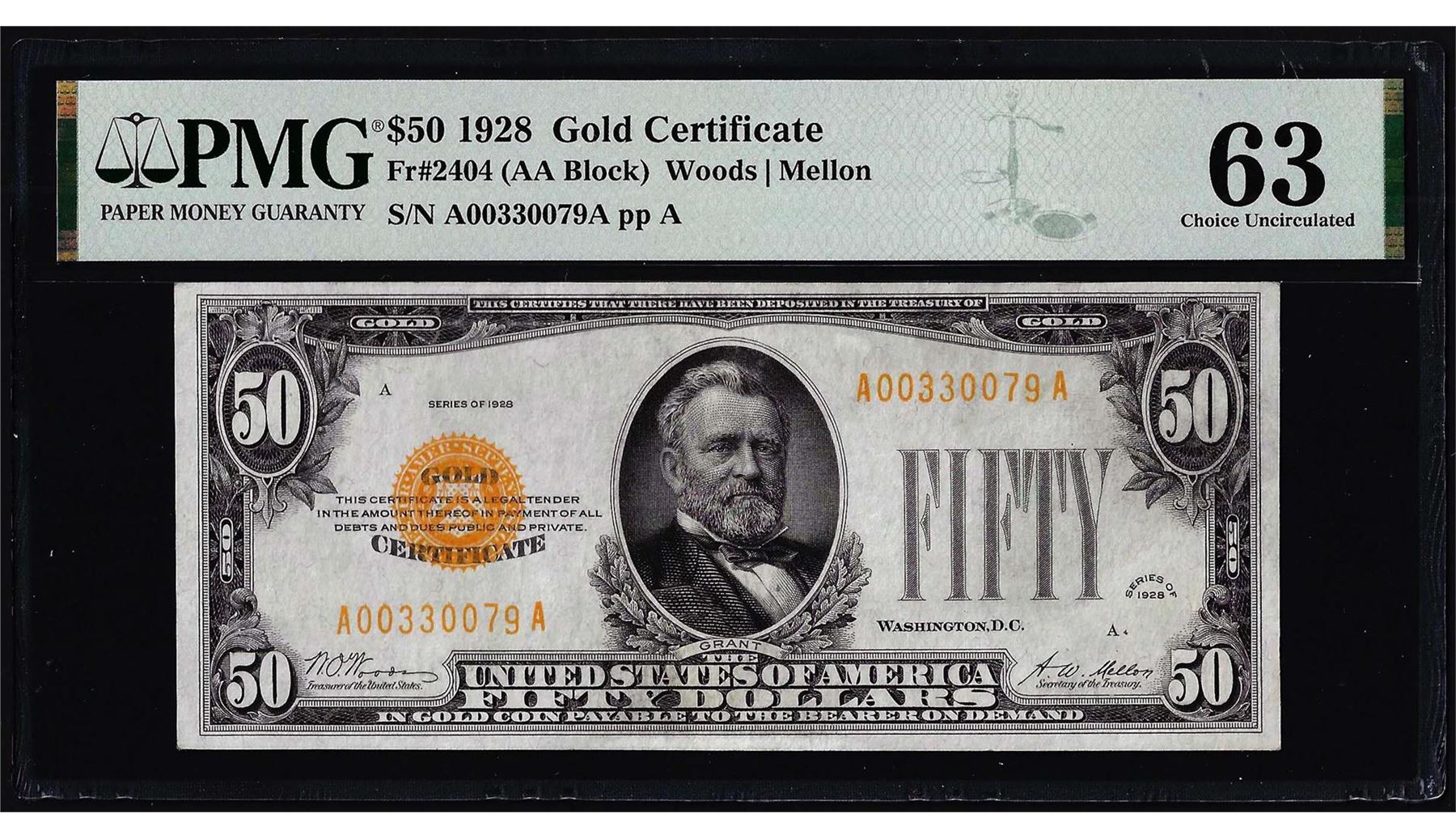 One 1928 $50 Gold Certificate Note Fr.2404 PMG Choice Uncirculated 63. PMG Certified.