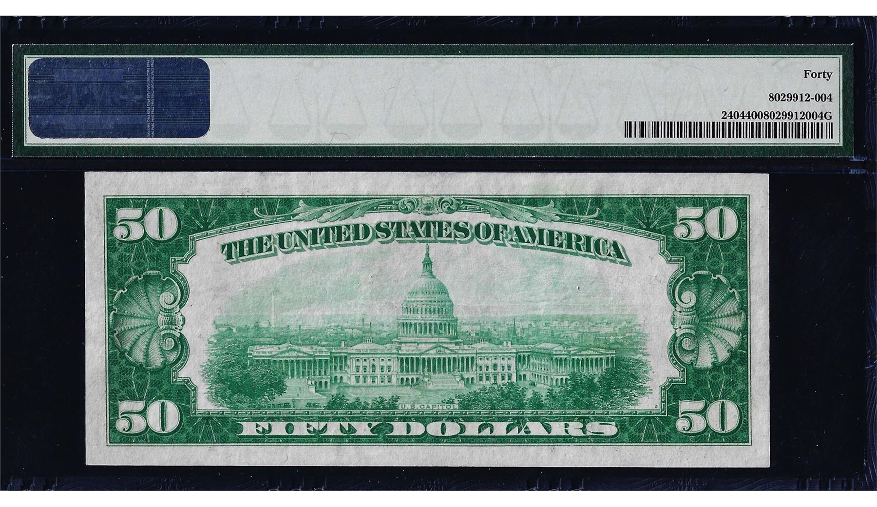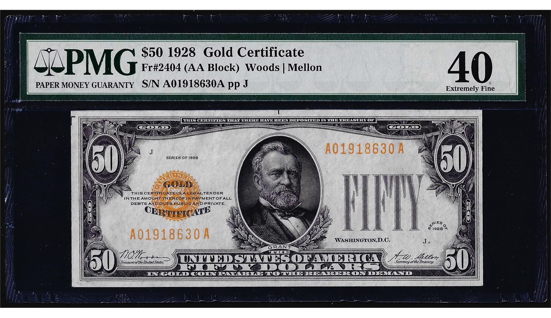 One 1928 $50 Gold Certificate Note Fr. 2404 PMG Extremely Fine 40. PMG Certified.