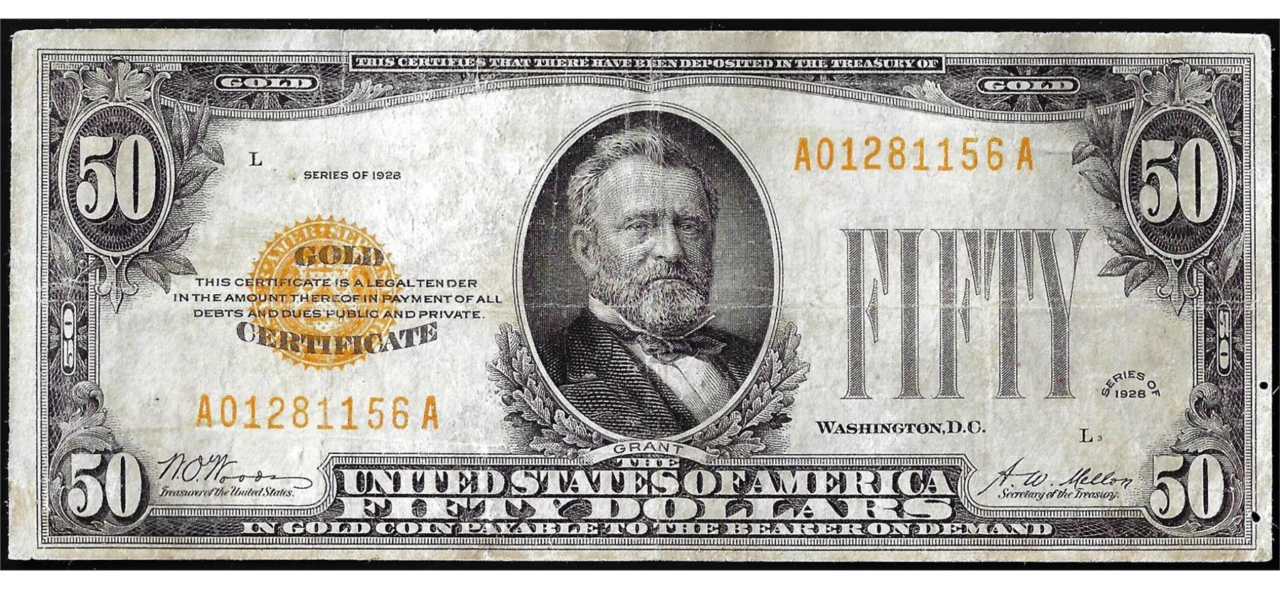 One 1928 $50 Gold Certificate Note.