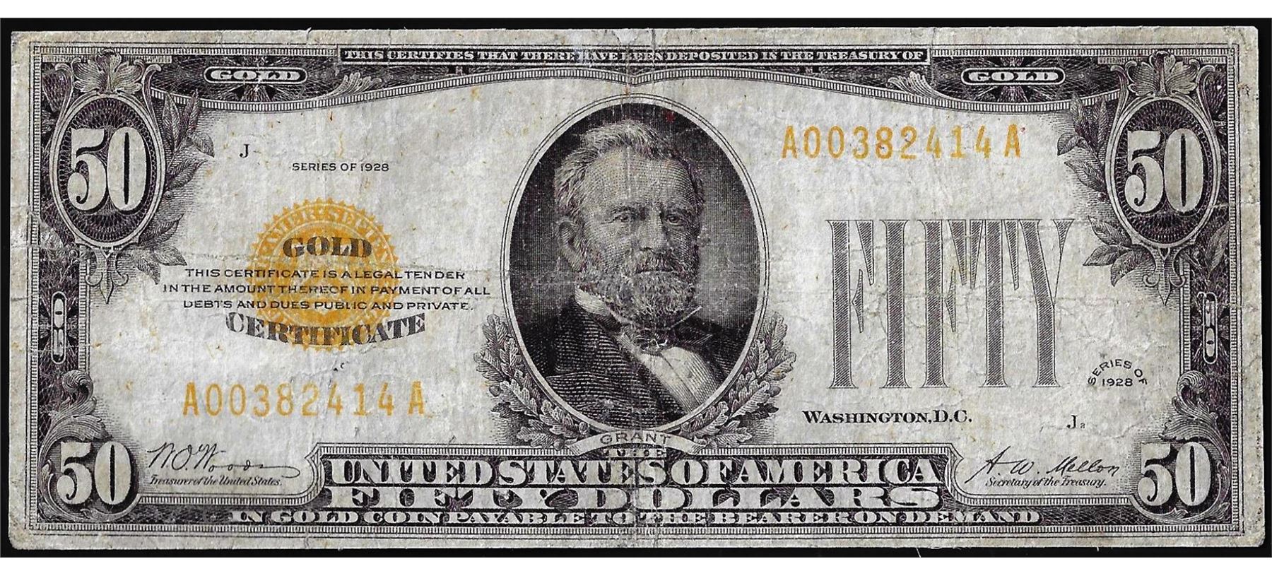 One 1928 $50 Gold Certificate Note.