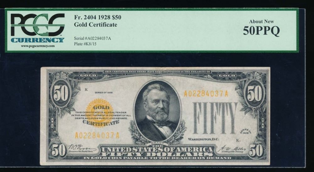One 1928 $50 Gold Certificate PCGS 50PPQ.