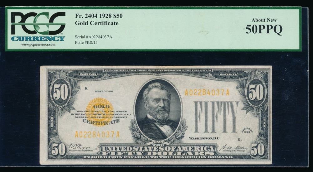 One 1928 $50 Gold Certificate PCGS 50PPQ.