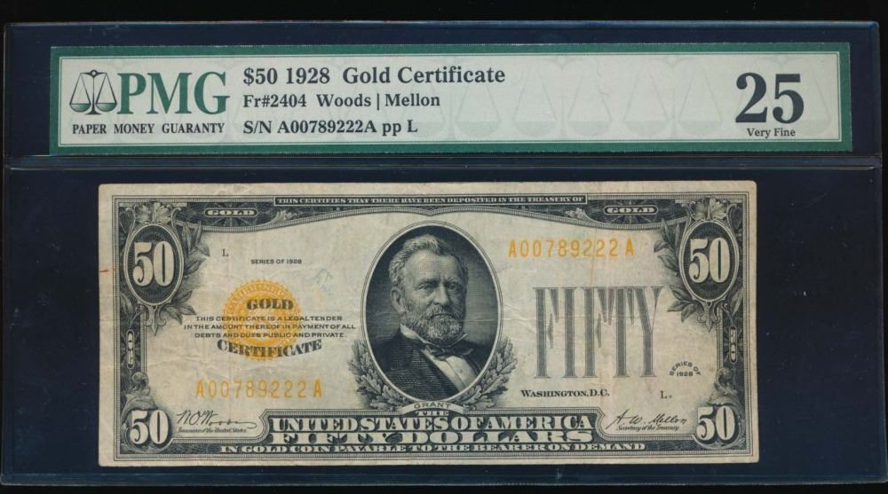 One 1928 $50 Gold Certificate PMG 25 Very Fine.