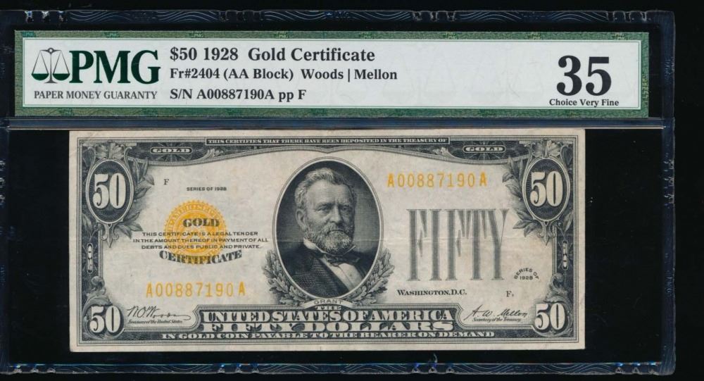 One 1928 $50 Gold Certificate PMG 35.
