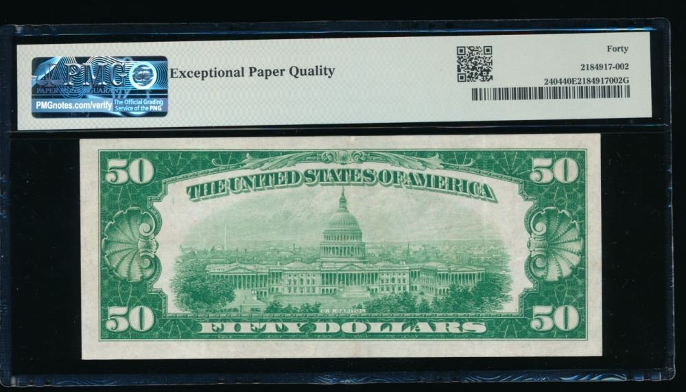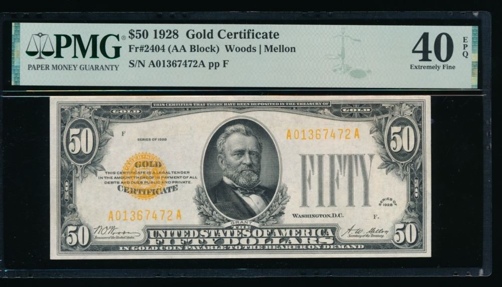 One 1928 $50 Gold Certificate PMG 40EPQ.