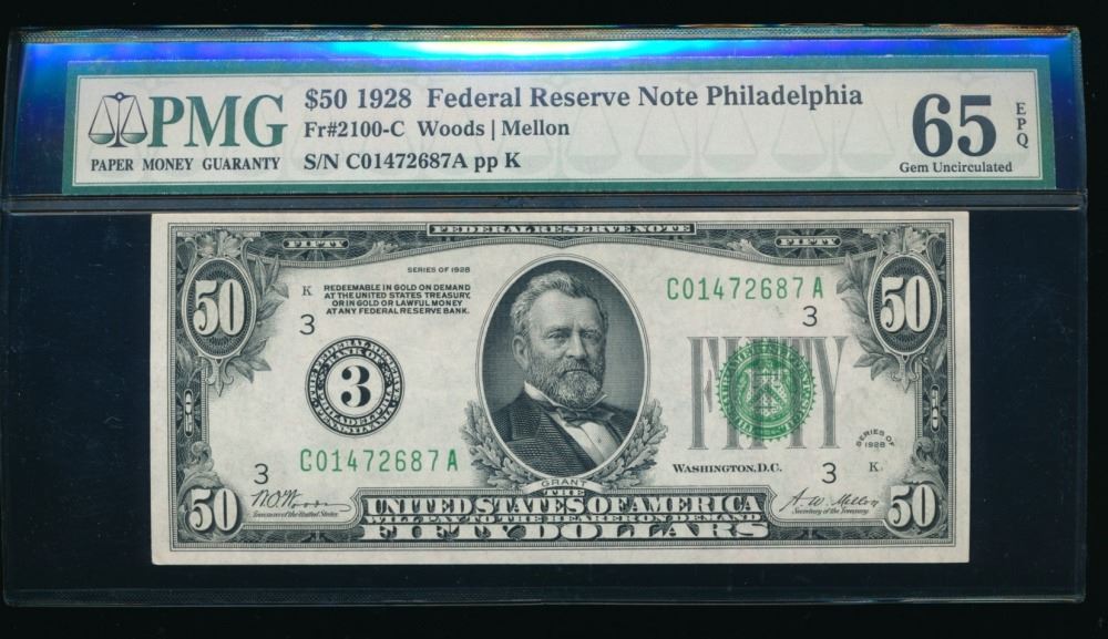 One 1928 $50 Philadelphia Federal Reserve Note PMG 65EPQ.