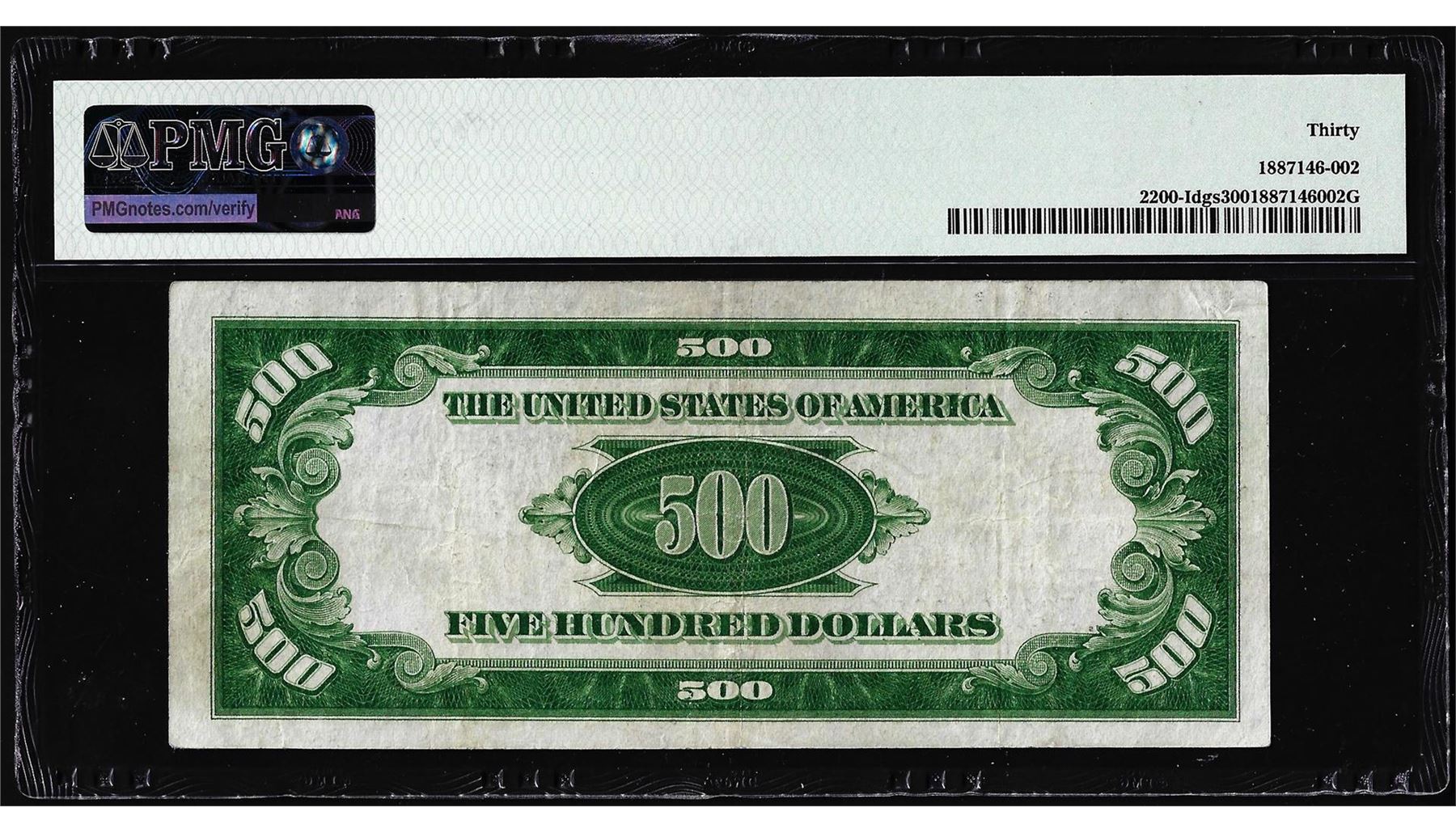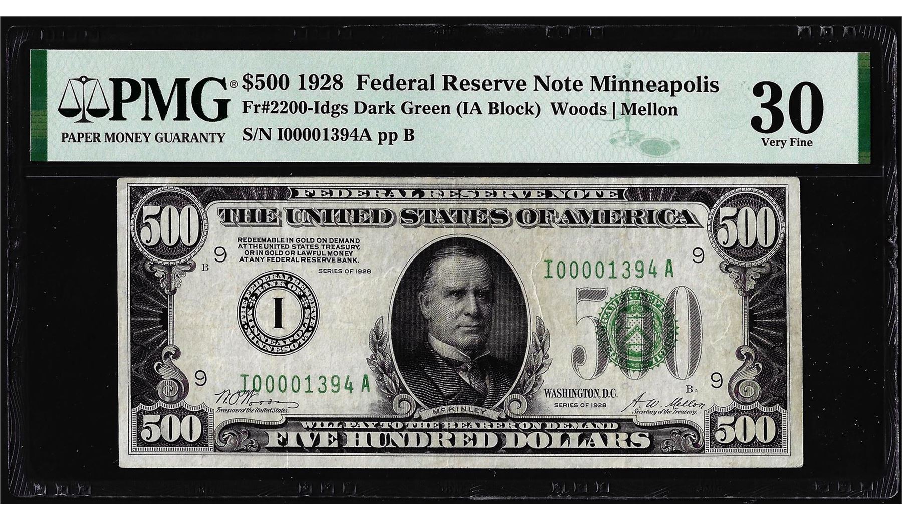 One 1928 $500 Federal Reserve Note Minneapolis Fr.2200-Idgs PMG Very Fine 30 Low Serial. PMG Certified.