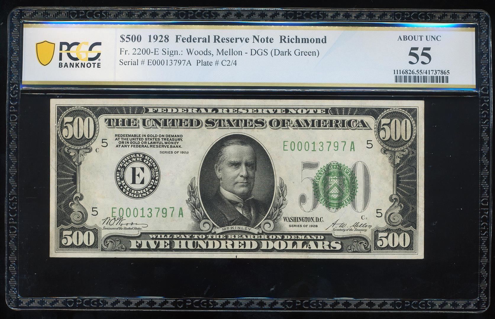 One 1928 $500 Federal Reserve Note Richmond Fr.2200-E PCGS About Uncirculated 55. PCGS Graded.