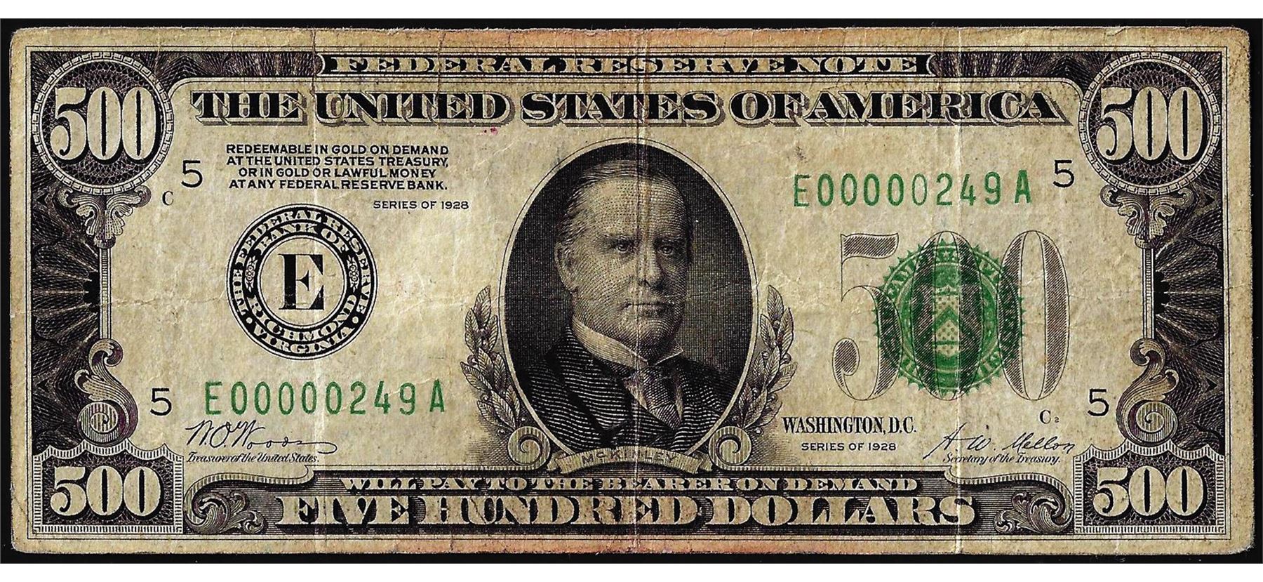 One 1928 $500 Federal Reserve Note Richmond Low Serial Number.