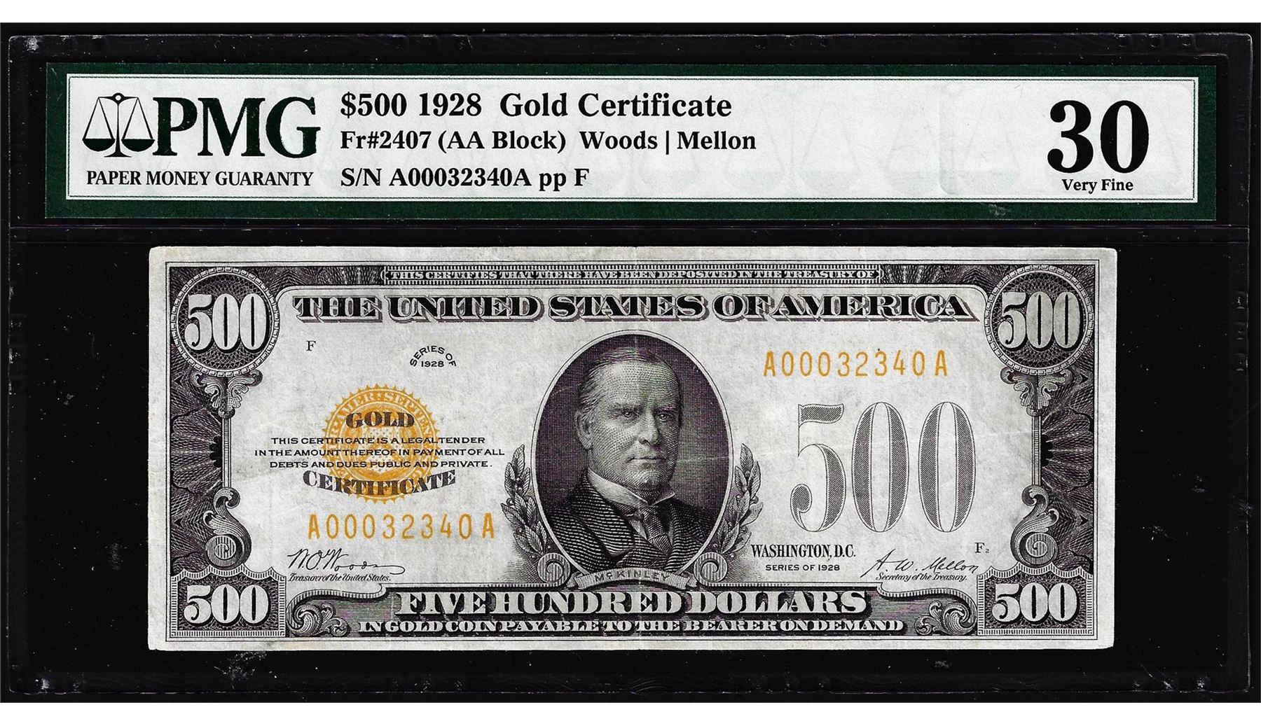 One 1928 $500 Gold Certificate Note Fr.2407 PMG Very Fine 30. PMG Certified.