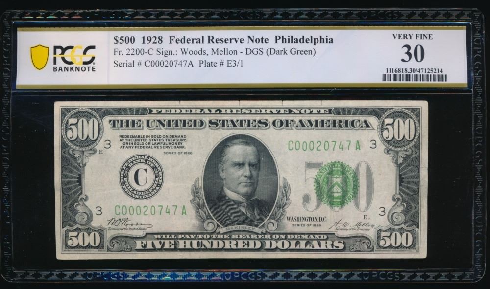 One 1928 $500 Philadelphia FRN PCGS 30.