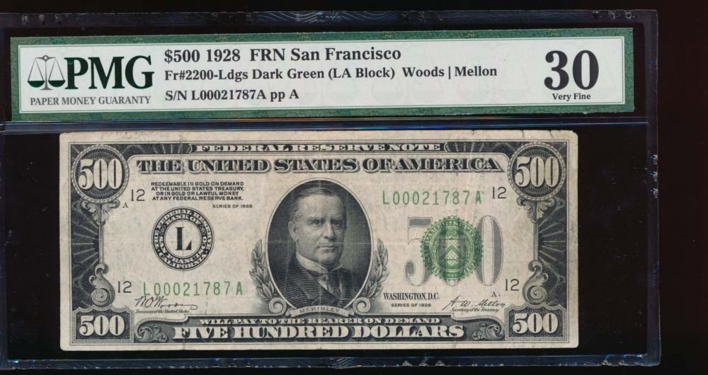 One 1928 $500 San Francisco Federal Reserve Note PMG 30. Minor Tears.
