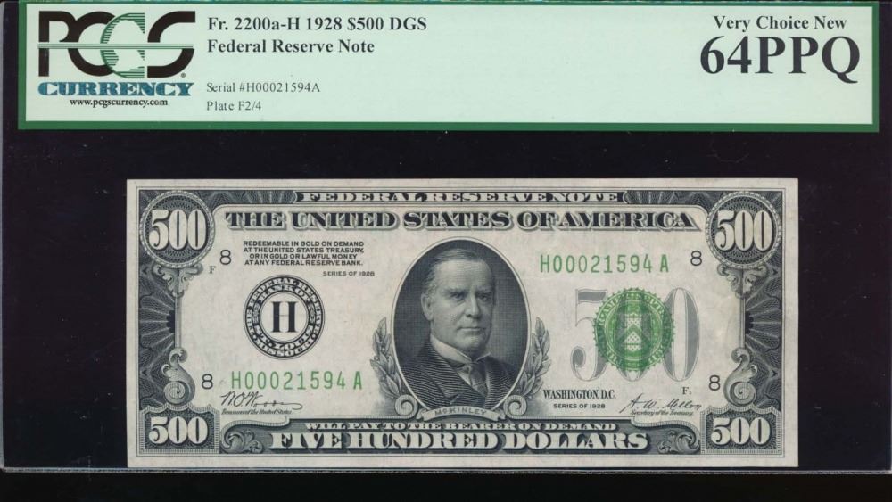 One 1928 $500 St Louis Federal Reserve Note PCGS 64PPQ.
