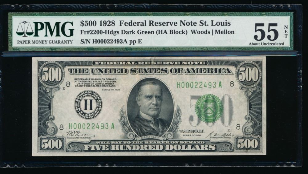 One 1928 $500 St Louis Federal Reserve Note PMG 55NET.