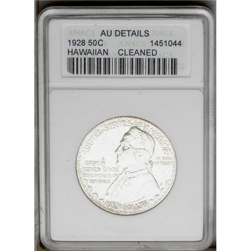 <B>1928<50C> Hawaiian--Cleaned--ANACS. AU Details.</B></I> Bright surfaces reveal fine hairlines, and are visited by a few speckles of tan patina around the peripheries. The design elements are sharply defined throughout. The only mentionable contact is a small milling mark in the lower right obverse field.