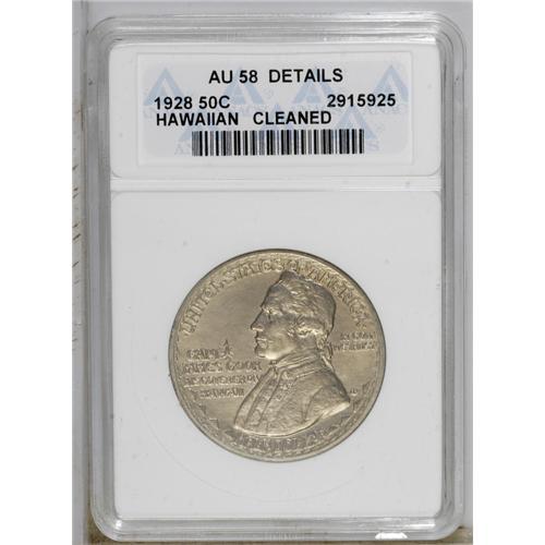 <B>1928 50C Hawaiian--Cleaned--ANACS. AU58 Details.</B></I> The uniformly reflective surfaces have light golden patina overall. Nicely struck with a hint of friction on the cheek and chieftain.<BR><BR><b>Shipping:</b> Coin/Currency (<a target="_blank" href="http://www.heritageauctions.com/common/shipping.php">view shipping information</a>)