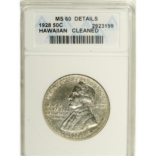 <B>1928 50C Hawaiian--Cleaned--ANACS. MS60 Details.</B></I> A brilliant and deceptively prooflike piece that exhibits faint vertical hairlines on both sides. Still a bold example of this coveted silver type.<BR><BR><b>Shipping:</b> Coins & Currency (<a target="_blank" href="http://www.heritageauctions.com/common/shipping.php">view shipping information</a>)