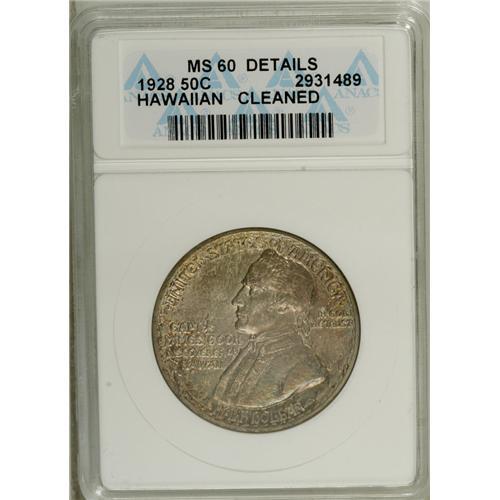 <B>1928 50C Hawaiian--Cleaned--ANACS. MS60 Details.</B></I> Mottled reddish-gold, green, and violet patina covers the surfaces, which have subdued luster. The strike is above-average.<BR><BR><b>Shipping:</b> Coin/Currency (<a target="_blank" href="http://www.heritageauctions.com/common/shipping.php">view shipping information</a>)