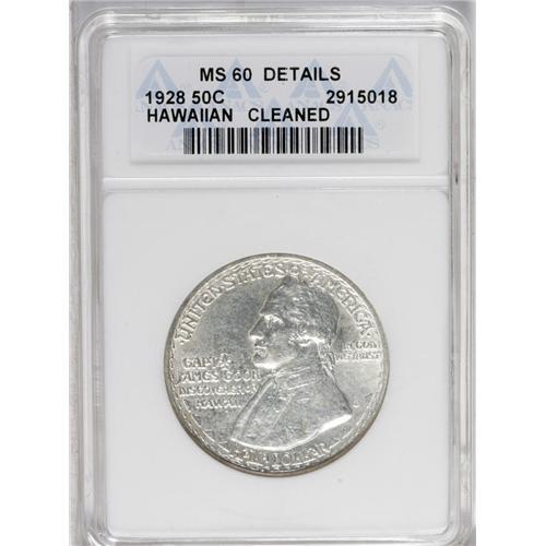 <B>1928 50C Hawaiian--Cleaned--ANACS. MS60 Details.</B></I> No trace of wear, though cleaning has removed most of the original luster. An affordable silver-gray example of this issue, the key to the silver commemorative type set.<BR><BR><b>Shipping:</b> Coin/Currency (<a target="_blank" href="http://www.heritageauctions.com/common/shipping.php">view shipping information</a>)