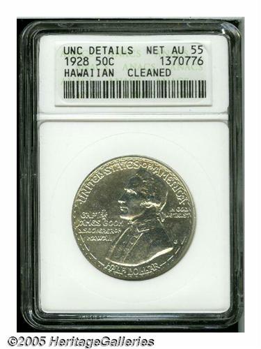 <B>1928<50C> Hawaiian--Cleaned--ANACS. Unc Details, Net AU55.</B></I> A shimmering and lightly toned example of this desirable low mintage Commemorative type. Wispy hairlines are noted but are not obtrusive.