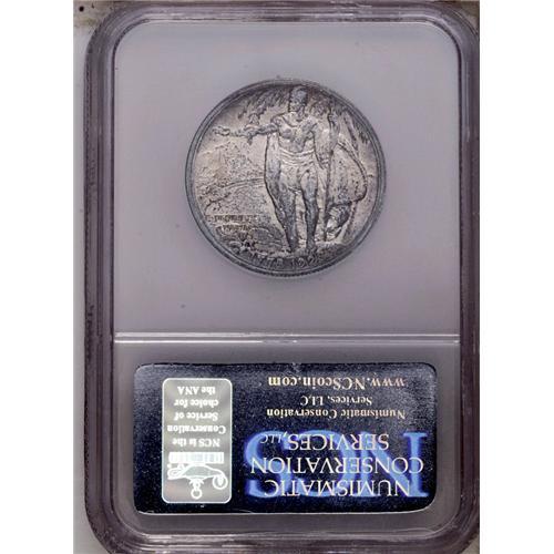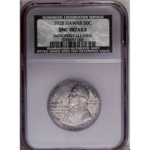 <B>1928<50C> Hawaiian--Improperly Cleaned--NCS. Uncirculated Details.</B></I> Pewter gray toning on unnaturally bright surfaces. One of the most desirable and eagerly sought issues in the commemorative half dollar series. Only 9,958 pieces were issued, a figure that many numismatists believe would have been substantially higher if the issue price hadn't been a staggering two dollars per coin, the highest initial price for a commemorative half dollar up till that time.