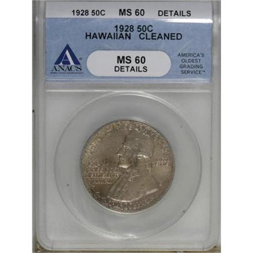 <B>1928 50C Hawaiian--Cleaned--ANACS. MS60 Details.</B></I> This lightly abraded key type commemorative has satin luster and medium powder-blue and chestnut-gold toning. No hairlines are visible beneath a loupe, even when the piece is rotated at obscure angles.<BR><BR><b>Shipping:</b> Coins & Currency (<a target="_blank" href="http://www.heritageauctions.com/common/shipping.php">view shipping information</a>)