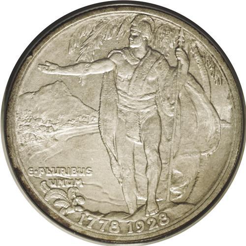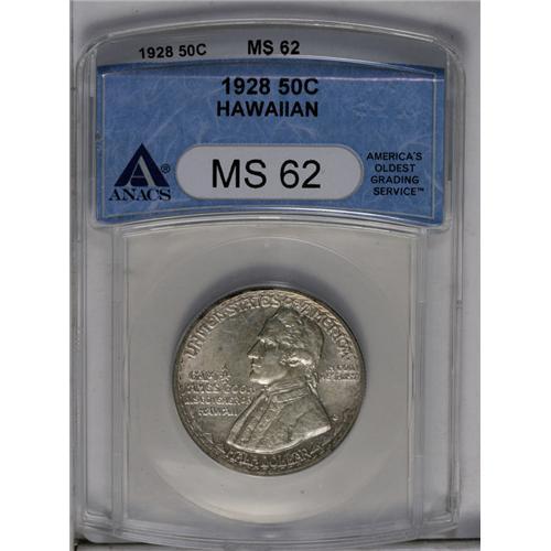 <B>1928<50C> Hawaiian MS62 ANACS.</B></I> A bit of pale lilac color circles the obverse with dove-gray patina elsewhere. Minimally marked for the grade, the underlying luster is too subdued for a finer grade.