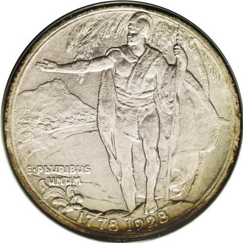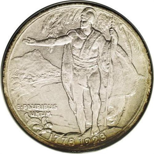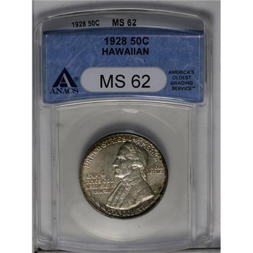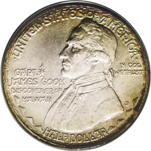 <B>1928<50C> Hawaiian MS62 ANACS.</B></I> Iridescent bands of orange, rose, and aqua enrich the margins, while the glossy fields and devices are cream-gray. Thorough examination locates a few unimportant marks on Cook's face, but these do not appear to limit the grade. The 1928 Hawaiian is the key to a silver commemorative type set.<BR><I>Ex: T.D. Walsh Collection (Stack's, 5/50), lot 416.</B></I><BR><I>From The Redfjord Collection.</B></I>