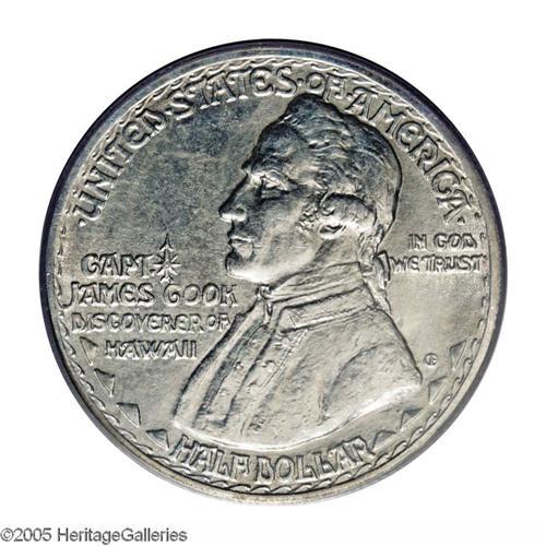<B>1928<50C> Hawaiian MS63 PCGS.</B></I> In June 1928, 9,958 Hawaiian Sesquicentennial half dollars were struck at Philadelphia. Distribution began through the Bank of Hawaii on October 8, 1928. Sales were brisk, and the supply soon sold out. This example is well struck, with bright lustrous surfaces visited by traces of light tan patina. A few minute marks on Cook's cheek define the grade.