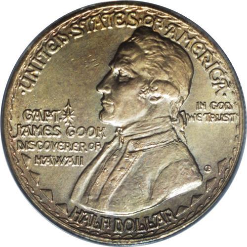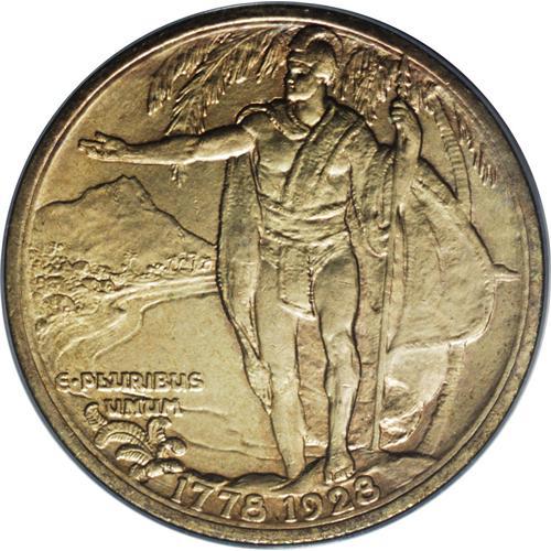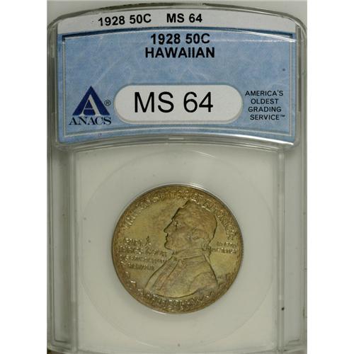 <B>1928 50C Hawaiian MS64 ANACS.</B></I> A light cast of yellow-gold toning over both sides deepens to amber and orange at the obverse rim, accented by tinges of ice-blue, and yet the luster emerges unimpeded from beneath the toning. This accurately graded piece just barely escapes Gem status because of some light ticks on Capt. Cook's cheek and the Hawaiian chieftain's thighs. An appealing example of this key-date commemorative half dollar.<BR><BR><b>Shipping:</b> Coins & Currency (<a target="_blank" href="http://www.heritageauctions.com/common/shipping.php">view shipping information</a>)