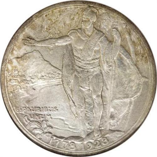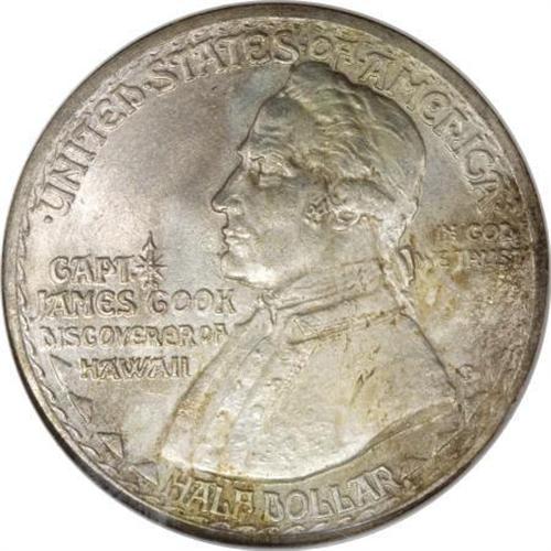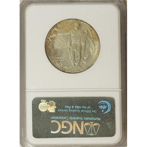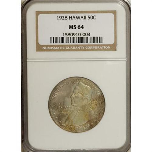 <B>1928 50C Hawaiian MS64 NGC.</B></I> This pleasing example has a delightful blend of heather, pewter, golden-brown, and lime toning on each side. Both sides are fully lustrous with satiny surfaces. The Hawaiian half dollar is an important low-mintage type issue, although pieces are generally available in a wide range of grades. NGC and PCGS have actually combined to certify 37% of the original mintage. Included with the lot is a Sept. 17, 1984 letter from the Captain Cook Coin Co. of Honolulu, Inc., signed by Craig Watanabe, testifying that a certain Hawaiian half (not included) is #7 of eight examples from the estate of Juliette May Fraser, designer of the Hawaiian Half.<BR><I>From The Frank DuVall Collection of U.S. Commemoratives.</B></I><BR><BR><b>Shipping:</b> Coins & Currency (<a target="_blank" href="http://www.heritageauctions.com/common/shipping.php">view shipping information</a>\)