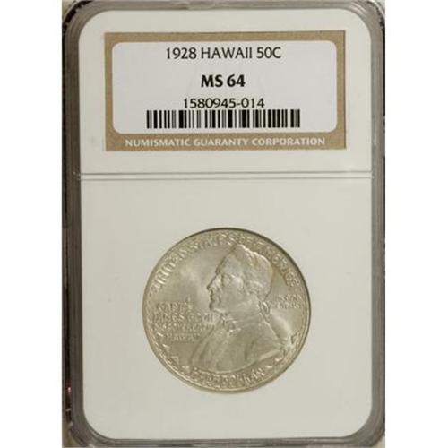 <B>1928 50C Hawaiian MS64 NGC.</B></I> Tints of sky-blue and beige patination are seen under magnification on this near-Gem Hawaii commemorative half dollar, and a well executed strike brings out sharp detail on the intricate design elements, particularly those of the beach landscape on the reverse. Lustrous surfaces reveal just a few minor grade-defining marks.<BR><I>From The Laguna Niguel Collection, Part One.</B></I><BR><BR><b>Shipping:</b> Coins & Currency (<a target="_blank" href="http://www.heritageauctions.com/common/shipping.php">view shipping information</a>\)