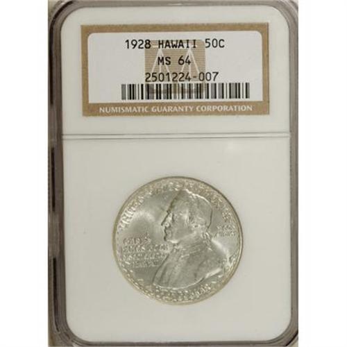 <B>1928 50C Hawaiian MS64 NGC.</B></I> This year's ANA offers "Captain Cook" or Hawaiian half dollars for every budget, one of the nicest selections we have presented in a single sale. This Choice, untoned example is very well struck and notable for its outstanding luster. A pair of milling marks are noticed in front of Cook's brow. <BR><BR><b>Shipping:</b> Coins & Currency (<a target="_blank" href="http://www.heritageauctions.com/common/shipping.php">view shipping information</a>\)