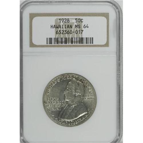 <B>1928 50C Hawaiian MS64 NGC.</B></I> A softly lustrous representative of this popular, low-mintage issue, one that was distributed largely to residents of the then-territory it celebrated. Hints of golden-tan toning grace the margins, while the centers are essentially unpatinated. The fields are clean for the grade, though a single horizontal abrasion on the cheek precludes Gem status.<BR><BR><b>Shipping:</b> Coins & Currency (<a target="_blank" href="http://www.heritageauctions.com/common/shipping.php">view shipping information</a>)