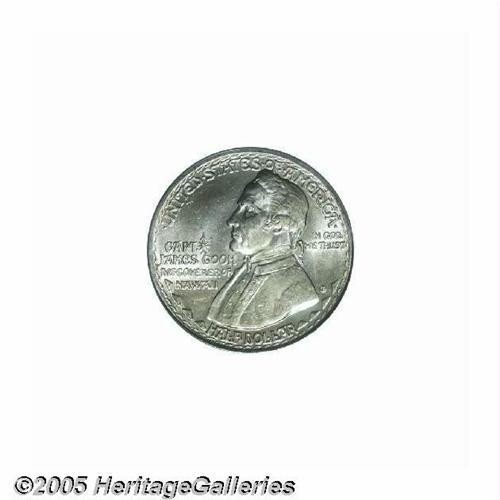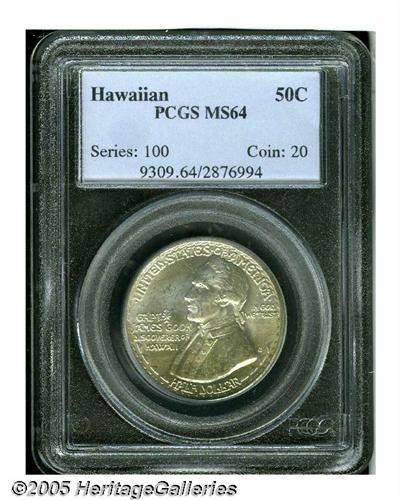 <B>1928<50C> Hawaiian MS64 PCGS.</B></I> A satiny white coin that retains strong luster and good eye appeal for a Hawaiian commemorative half. Often these are toned with less than alluring yellow hues, but not so on this coin. Well struck and preserved, with scattered ticks from handling, visible with a strong loupe. One of the key issues to the series, and always in strong demand for nice coin.