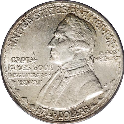 <B>1928<50C> Hawaiian MS64 PCGS.</B></I> Both sides display shimmering, satiny luster with untoned centers that give way to flecks of light golden peripheral color. A mere 9,958 pieces were struck to commemorate the 150th anniversary of Captain James Cook's "discovery" of the Hawaiian Islands.