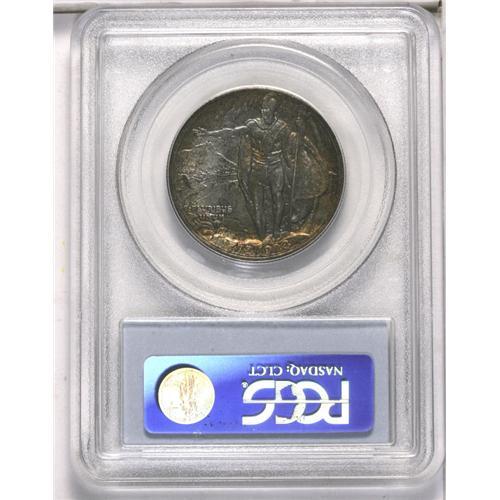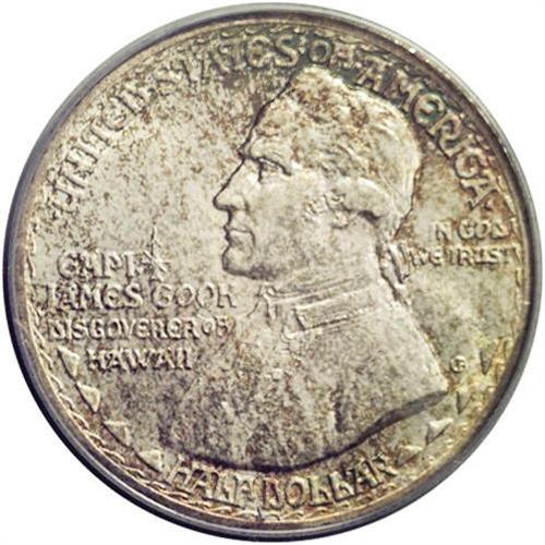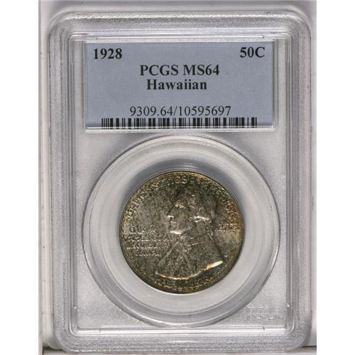 <B>1928<50C> Hawaiian MS64 PCGS.</B></I> Colorfully toned in mottled shades of blue-gray, golden-russet, olive-green, and antique-gold. Well struck throughout, coruscant, satiny luster underlies the rich patina on each side. Close examination reveals a few small marks in the left obverse field, these being mostly obscured by the toning.