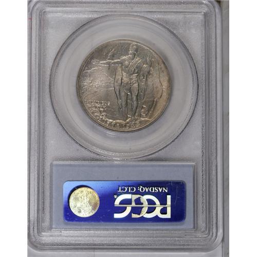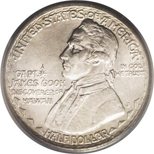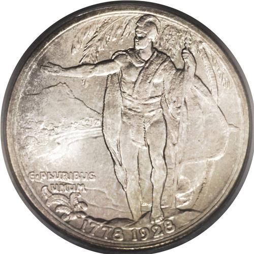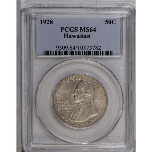<B>1928<50C> Hawaiian MS64 PCGS.</B></I> Perennially popular for its rarity, its design--and possibly because of its whiff of palm trees, coconut groves, and native wilderness--the Hawaiian half is permanently endeared in the hearts of commemorative coinage aficionados. This example offers a light patina of pinkish-gold, with glimpses of magenta and jade-green. Light ticks in the obverse field and on Captain Cook's visage remove this piece from Gem consideration, but the Hawaiian chieftain is relatively unabraded. A high-end and appealing example.