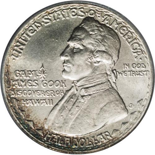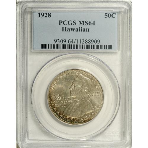 <B>1928 50C Hawaiian MS64 PCGS.</B></I> Slender bands of sea-green and chestnut-gold grace this satiny near-Gem. The obverse field is remarkably smooth, and only a determined examination will find the few tiny reverse ticks that decide the grade. Perhaps the only U.S. commemorative type to honor a British explorer.<BR><BR><b>Shipping:</b> Coins & Currency (<a target="_blank" href="http://www.heritageauctions.com/common/shipping.php">view shipping information</a>)